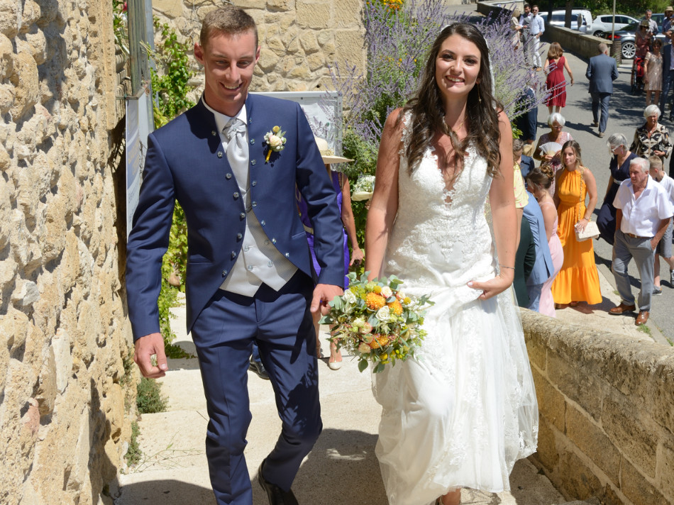 Notre mariée a convolé avec une robe fluide légèrement sirène tout en dentelle tulle rebrodée et une longue traine, qu'elle avait délicatement recouverte d'un voile tout aussi long en tulle fin bordé d'une large guipure, ce qui lui donnait un cachet très personnel.