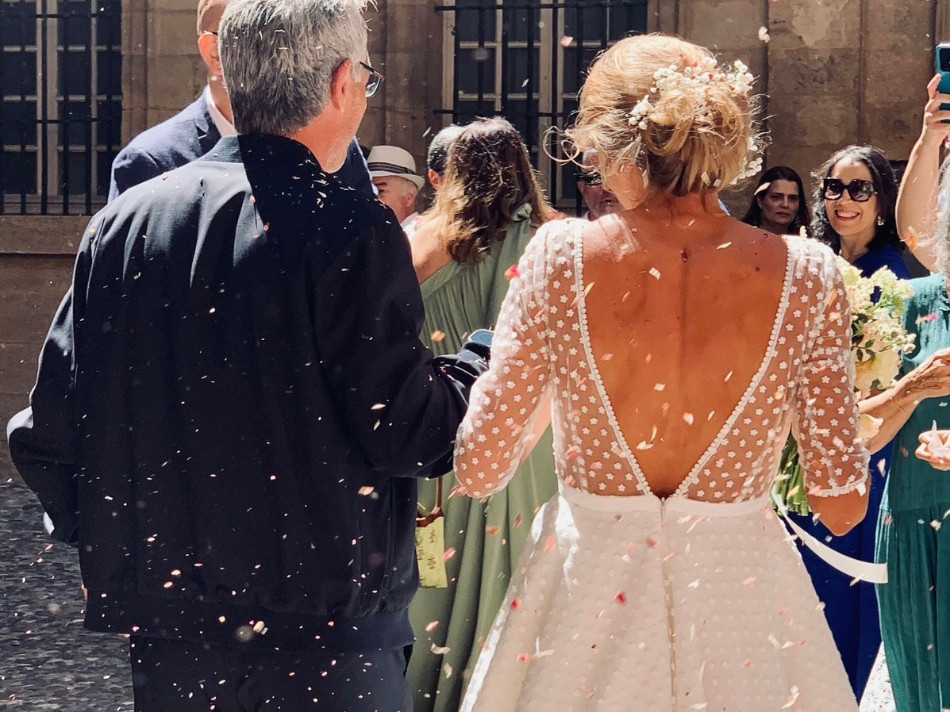 Carine souhaitait un mariage chic mais décontracté, quand elle est venue choisir sa robe avec ses filles, le choix paraissait évident ; Baccara était la robe qui collait à la personnalité de Carine. Un tulle parsemé de petites marguerites, un dos nu en V à tomber par terre ... et une légèreté qui lui permettait de convoler très à l'aise dans ses jolies baskets blanches.