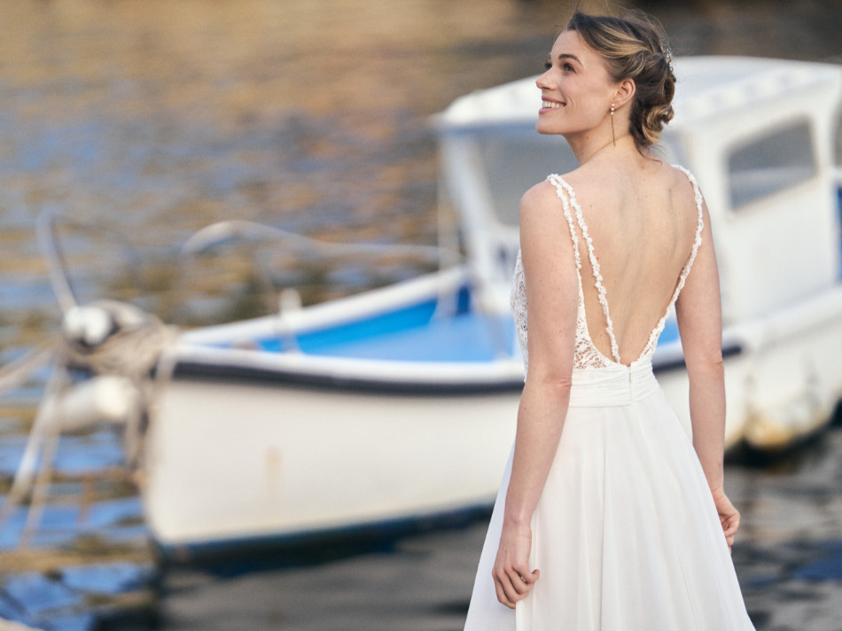 Dans ce décor aux accents du sud, Laura porte ELLI, une création délicate signée Rembo Atelier et Marylise Bridal. Une robe qui conjugue poésie et modernité, idéale pour celles qui rêvent d’un look élégant et sans effort.