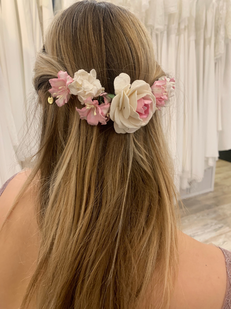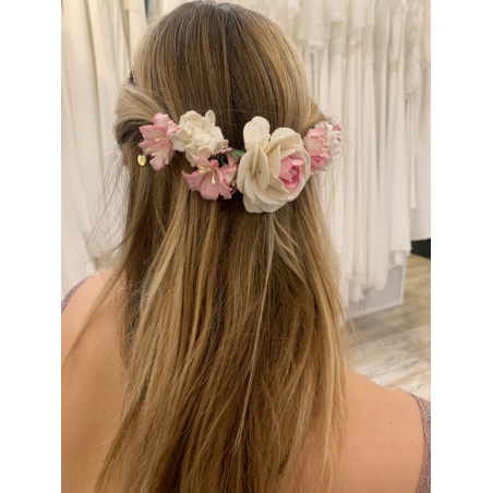 Délicate demi couronne de fleurs, blanches et rose poudré.