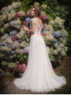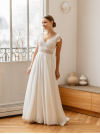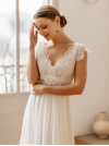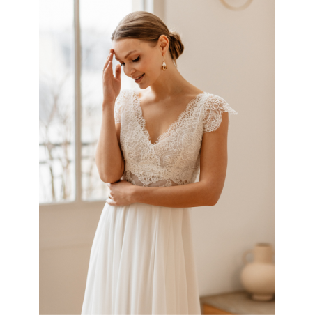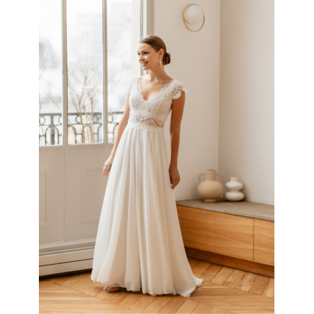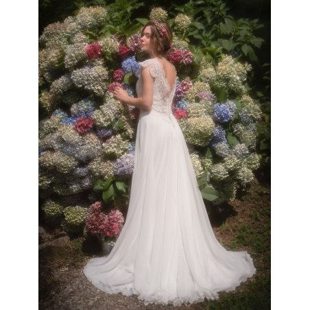 Robe qui habille à merveille la plupart des silhouettes. Son joli décolleté en V arrondi incrusté de dentelle de Calais et son dos boutonné comme les corsages de nos arrière grands-mères, c'est un joli clin d'oeil nostalgique. La jupe très féminine avec de jolis plis en mousseline recyclée et une jolie petite traîne