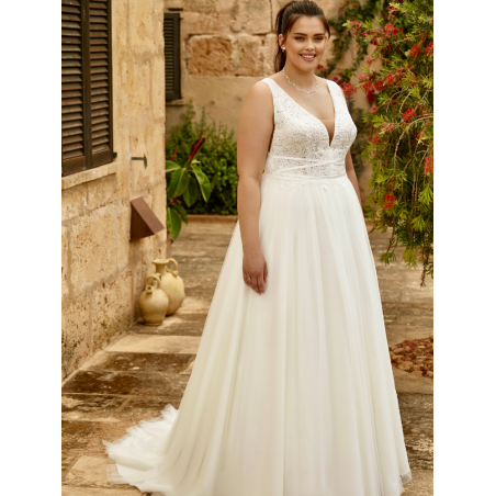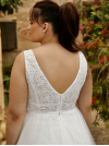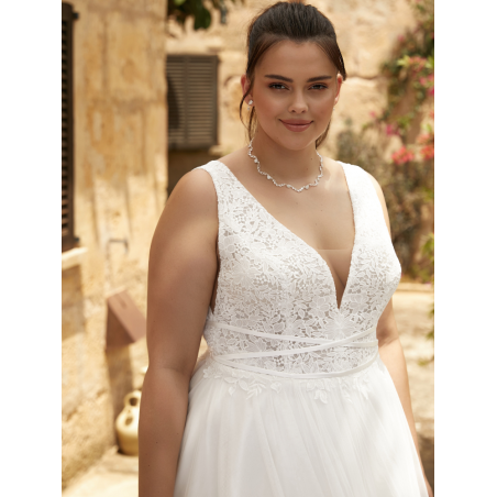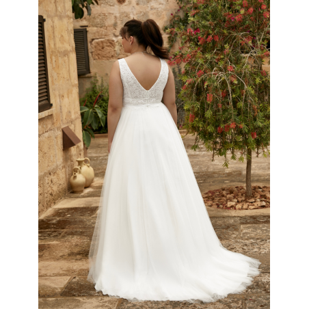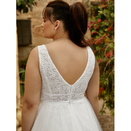 Une coupe parfaite pour mettre en valeur une jolie taille, une jupe en tulle toute légère et une jolie dentelle habille le buste au superbe dos nu.