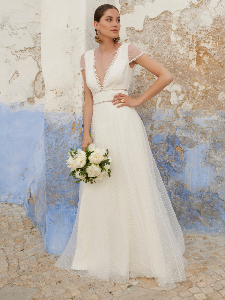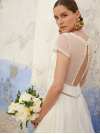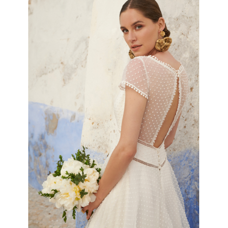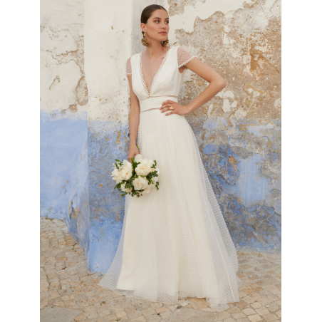 Une coupe parfaite pour mettre en valeur la taille et le buste. Réalisée en tulle plumetis, assez atypique mais tellement sage tout de même.