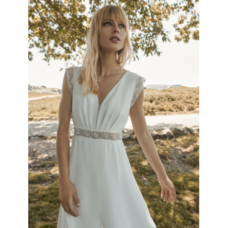 Robe en crêpe simple et élégante avec un décolleté en V raffiné. Le dos ouvert est sublimé par de la dentelle, qui se retrouve également sur les petites manches courtes. La jupe est légère et fluide.