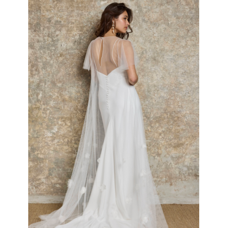 Robe fluide en crêpe, style épurée, entre la robe de mariée et la robe du soir..... très glamour avec ses bretelles spaghetti et sa fente sur la jambe. Le dos est particulier avec une double ouverture.