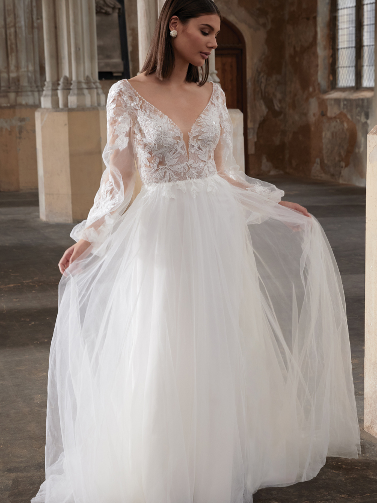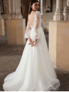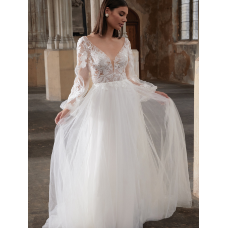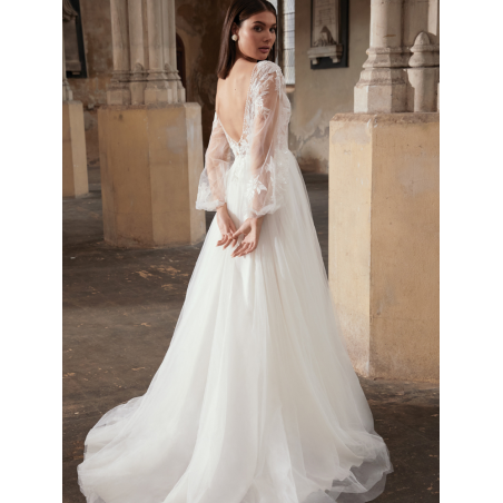 Décolleté en coeur, tulle brodé de sequins et perles... jupe fluide et ample... Et des manches longues rebrodées ultra large qui donne toute l'allule magique de ce modèle.