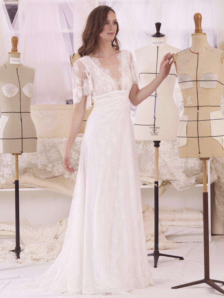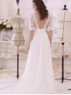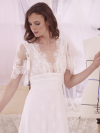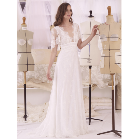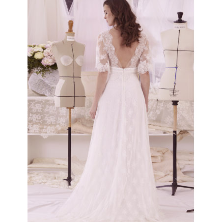 Robe fourreau, fluide en dentelle fine de Calais, manches pagodes. Dos nu et transparence... le vrai savoir-faire de nos ateliers français !