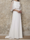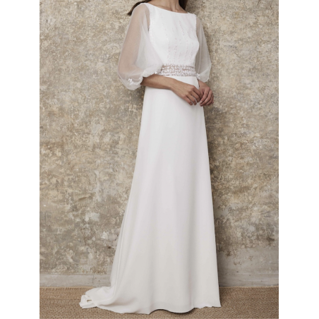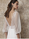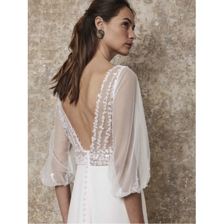 Robe ultra légère à l'allure plutôt sage, avec son encolure bateau et son superbe dos nu tout en transparence. Le buste est recouvert de voile tout comme les manches bouffantes . De fins sequins sont éparpillés sur le dos et la taille.