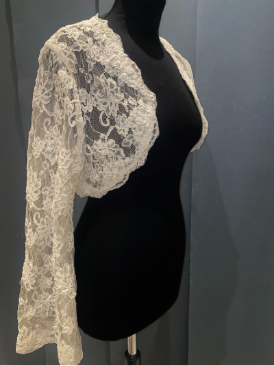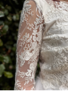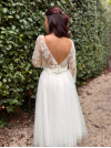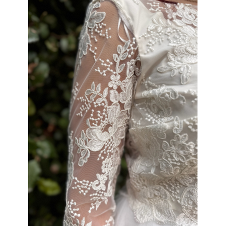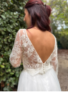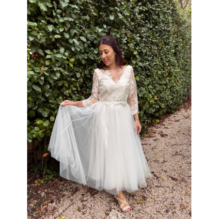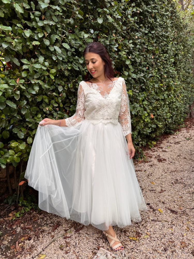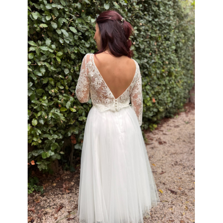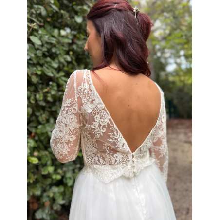 Crop top, parfait pour assembler avec toutes les jupes longues. Joli décolleté bateau et grand dos nu en organza rebrodé, dessin moderne.