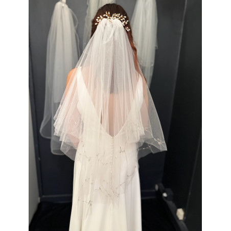 Voile de mariée double, en tulle bordé de strass, ce voile saura habiller et compléter avec élégance toutes les tenues.